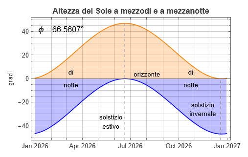 Nella figura 6.7 emerge visivamente come l'altezza massima venga raggiunta nel giorno del solstizio estivo \(a_{max}=90^\circ-\phi+\epsilon=68.44^\circ\) mentre il valore minimo in quello invernale \(a'_{max}=90^\circ-\phi-\epsilon=21.56^\circ\). Rilievi opposti si possono riportare per l'altezza del Sole sotto l'orizzonte e interpretabili per le latitudini australi scambiando notte e dì.